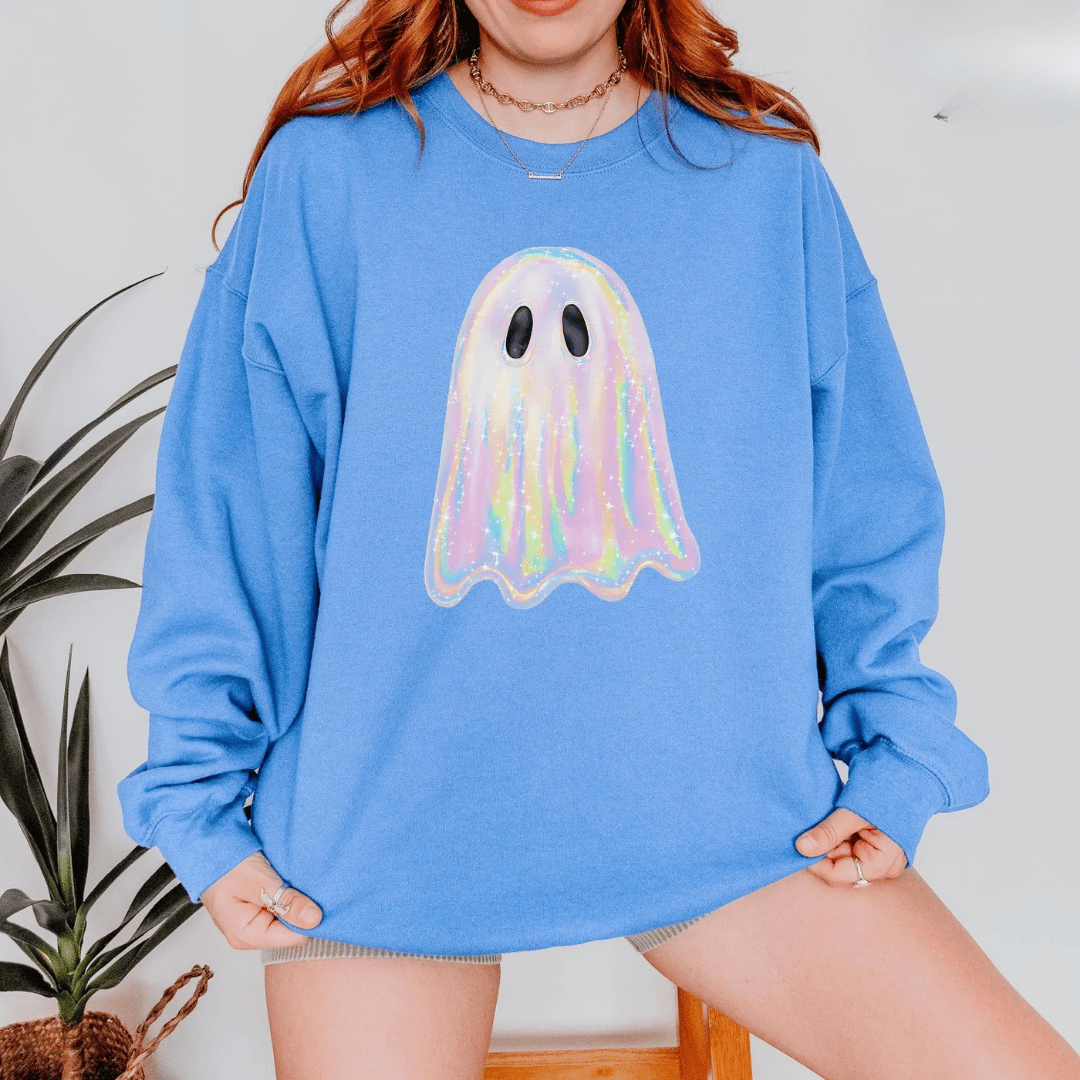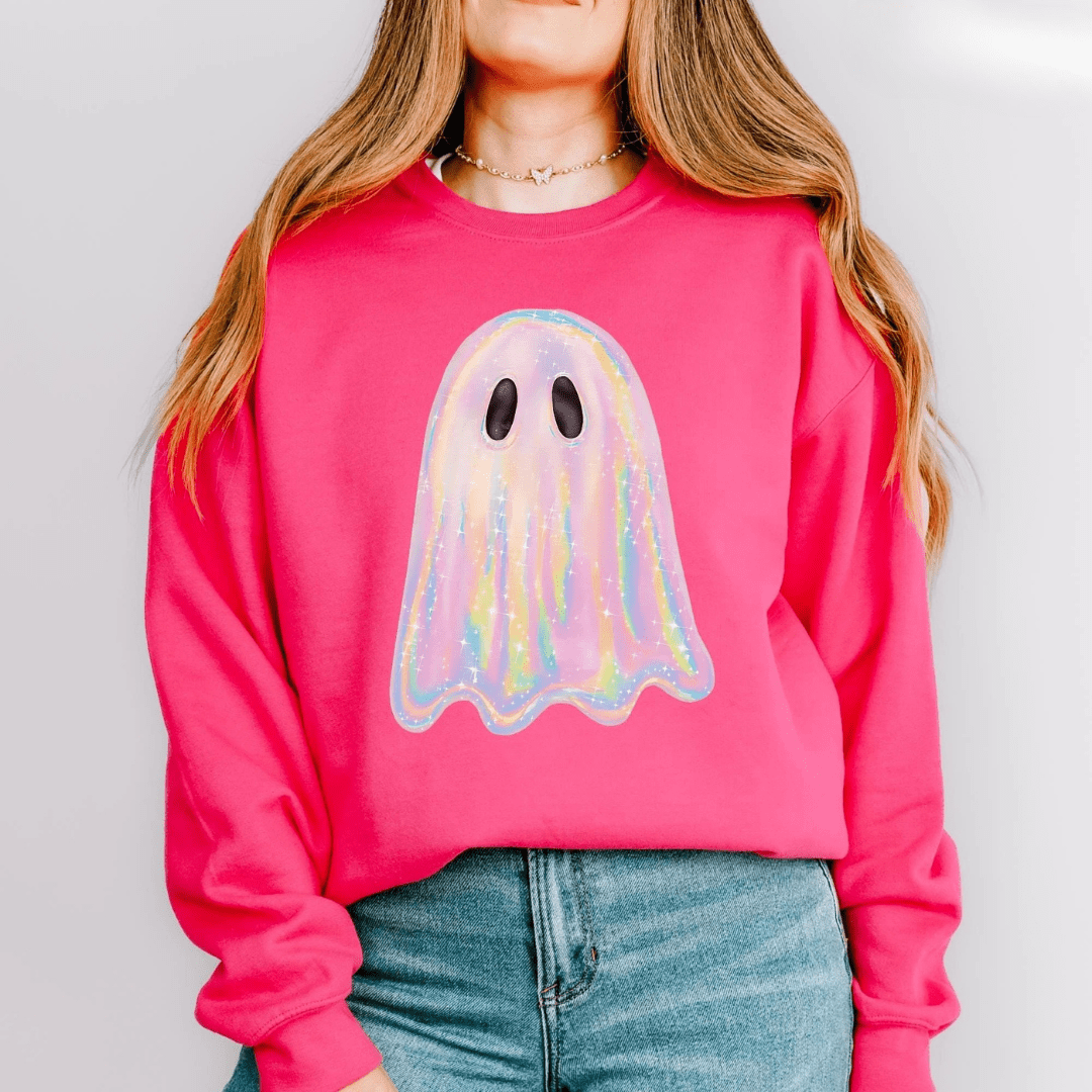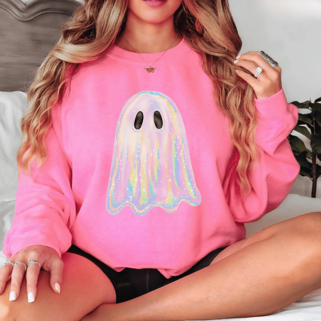 Light up your look with this holographic shimmer ghost design on a bold pink sweatshirt. It's the perfect mix of cozy comfort and spooky-cute sparkle.